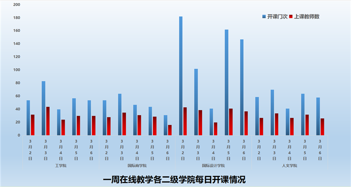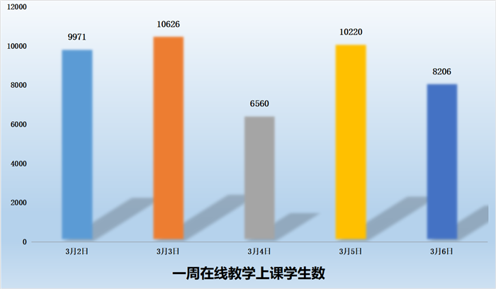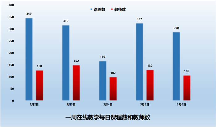 3月2日-3月6日期间,共有在线教学课程253门、1454门次;共有学生45583人次上课;共有190位教师进行了在线教学。学校积极落实了在线教学第二周对学生“全覆盖”的要求,基本保证学生每天在线学习。