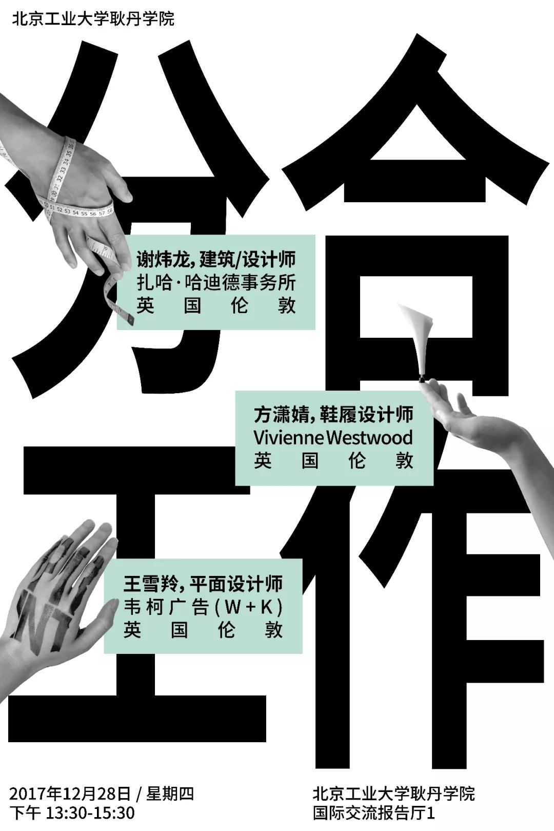 12月28日,国际设计学院视觉传达专业在国际交流中心报告厅举办了“合作分工/分工合作”讲座,讲座由夏岩枫老师主持,邀请了伦敦ZAHA HADID建筑事务所资深设计师谢炜龙、Vivienne Westwood鞋履设计师方潇婧、Wieden+Kennedy平面设计师王雪羚。