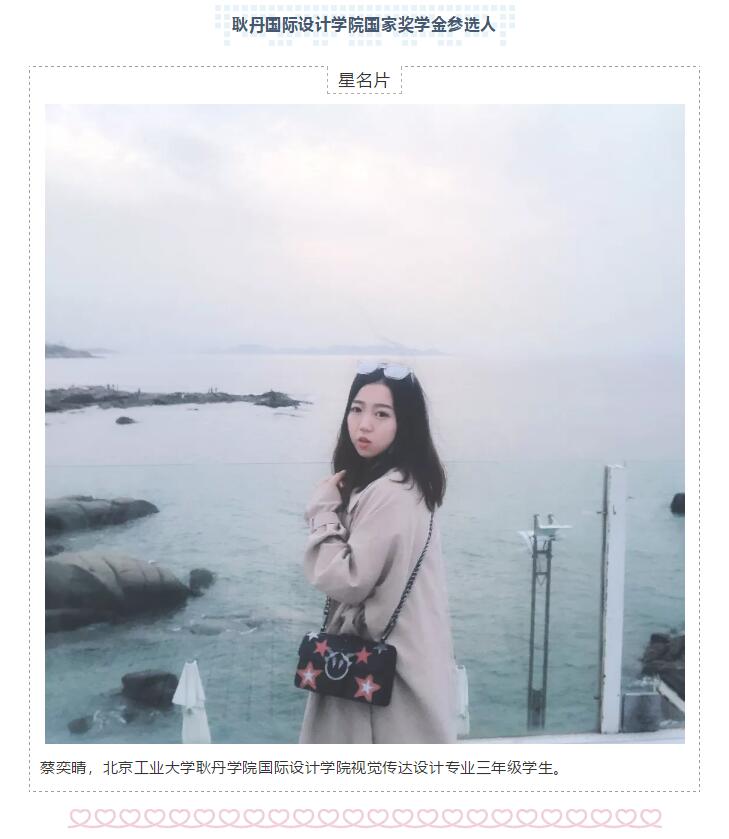 蔡奕晴:在大二我担任班级学习委员,努力营造班级的良好学习氛围,协助班长、团支书组织一些班级活动,促进同学们之间的感情。工作中我充分发挥一个学生干部的模范带头作用,与大家共同努力,按照学院和老师的要求,创造一切能够让班级发展的条件和空间。一年的尽心尽职得到了大多数同学的认可,所在班级荣获了“先进团支部”,我也荣获了学校“优秀学生干部”的称号。并且,我还担任了院青年志愿者协会的宣传部部长,协助组织各项活动,做好活动的前期宣传,协调各部门之间的关系,锻炼了自己的协调组织潜力的同时,接触了很多无私奉献的志愿者,自己的心灵能到了很大的触动,思想得到了熏陶和提升。作为一名青年志愿者,我主动参加各项市级、校级志愿者活动,把奉献、友爱、互助、进步的志愿者精神牢记在心,实践于行。此外,我还在学院宣传中心担任学生助理一职。协助老师负责学校外宣品、宣传册、书籍的设计工作,包括为2018级新生设计的《新生修炼手册》、学院手提袋和一次性纸杯等等,我所设计的作品受到了领导老师们的认可。正是我身上担当的这些责任,使我养成了细心、严谨认真的习惯。