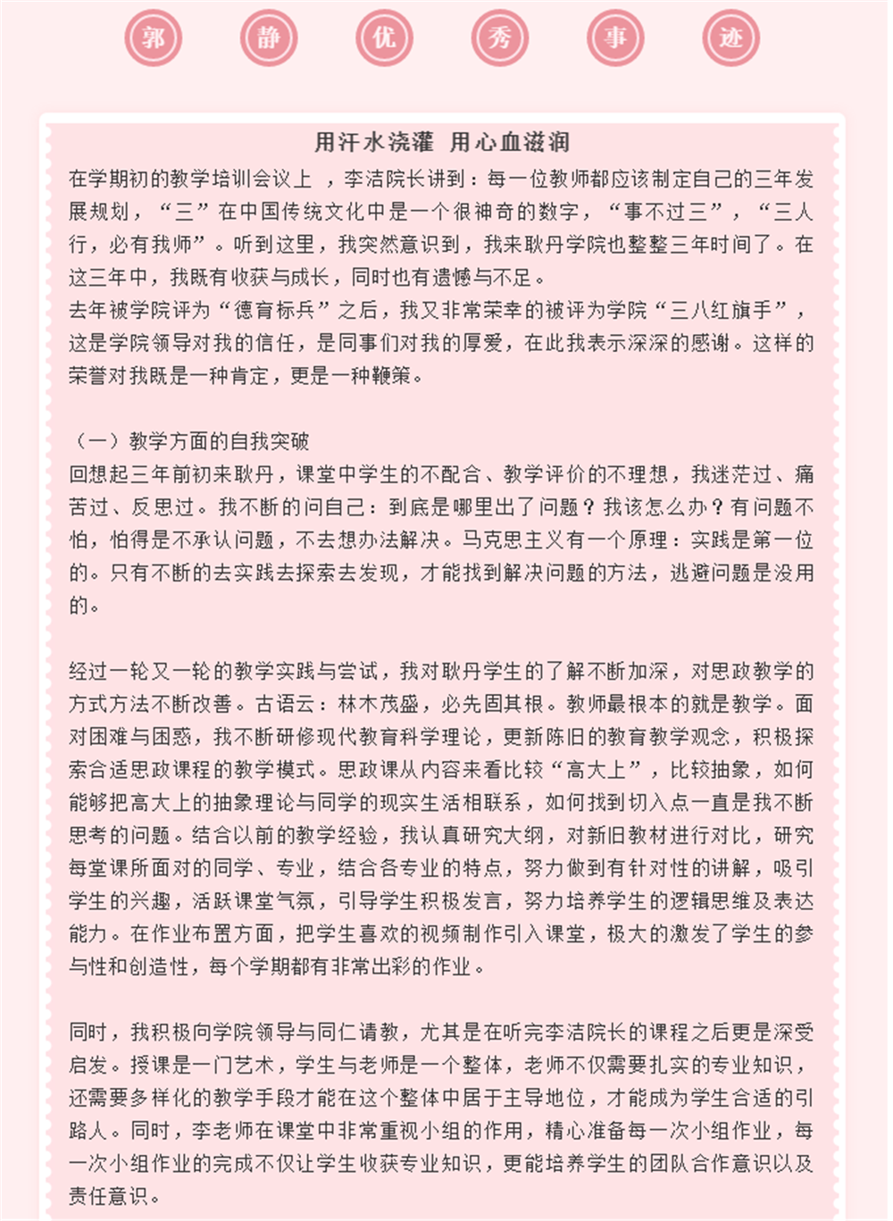 根据人文学院关于推荐2021年三八红旗手候选人的有关工作要求,经各教研室推荐,本次思政教学部郭静老师评选为人文学院“三八红旗手“荣誉称号。