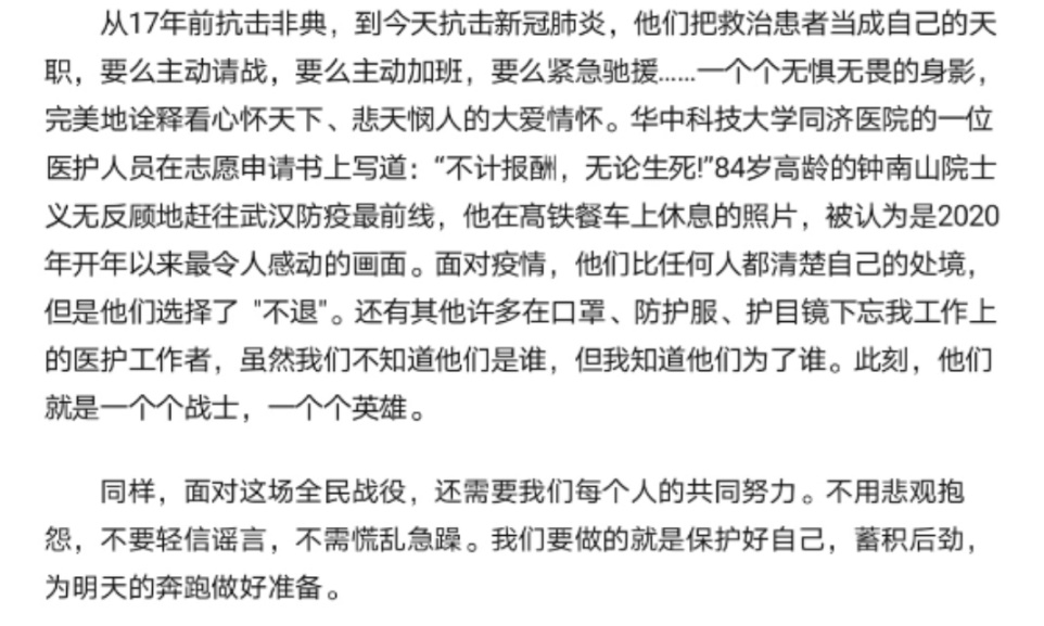 不敢忘,那个耄耋之年临危受命奋斗与疫情第一线的终南山院士,不敢忘,那些写下锵锵有力誓言的白衣天使们。班级的同学也为他们写下了寄语。