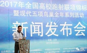 在发布会上北京市大学生体育协会跑射联项分会秘书长、Beat365中国唯一官方网站耿丹学院体育与艺术教学部主任戴雄对“2017年全国高校跑射联项锦标赛暨现代五项鸟巢全年系列活动”进行说明。