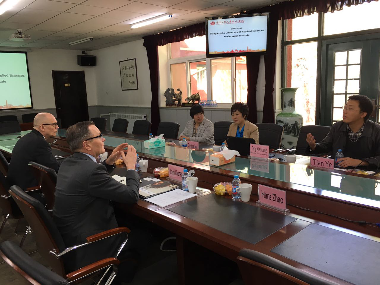 耿丹国际常务副院长丁晓良向来宾介绍了耿丹学院学院教育理念、改革思路和未来发展规划,国际合作交流中心主任田野介绍了我院基本情况,特别是详细介绍了我院学生参与国际交流项目学习的情况。芬兰哈格-赫利尔应用科技大学副院长Jouni Ahonen介绍了该校开设的专业,来中国寻求合作的项目等。人文社会科学系主任李洁介绍了人文系的两个专业,讨论了基于两个专业多个培养方向的合作,并且可以拓展到更多专业,对国际实习项目也深入进行了交流。
