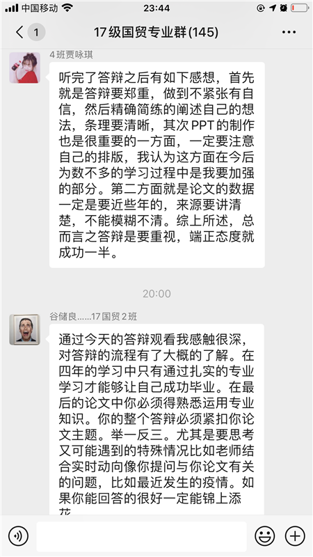 答辩结束后,同学们还在班级群进行了热烈的讨论,发表的感想达三万字之多。同学们认为大四学长学姐们在答辩时,清晰的思路、严谨的态度、详实的论证、正式的着装都令他们大为惊叹。同学们纷纷表态一定要认真学习专业课,未来也可以像学长学姐们一样运用更多的专业知识进行论文答辩。同学们表示旁听了这次答辩之后,对今后的学习有了更明确的目标,去努力、奋斗、拼搏,立志做一个对社会有贡献的人!不忘初心,砥砺前行!