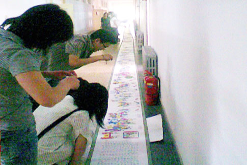 面对展示的《农家乐》木版年画,得到了师生们的赞叹。在32米长、无接缝的纸上绘满了年画里常出现的民俗风情。据介绍,该《农家乐》的创作共用531面梨木画版,有1008个人物,在一张无接缝的纸上手工水印而成。现代印刷术难以完成,是用祖先1000年前创造的木版年画技术把它完成的。