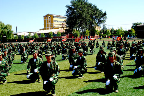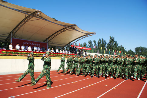 开学典礼在庄严的国歌声中开始。刚刚结束军训的2008级新生首先进行了军训汇报表演,激昂的口号和整齐统一的表演赢得了现场阵阵掌声。