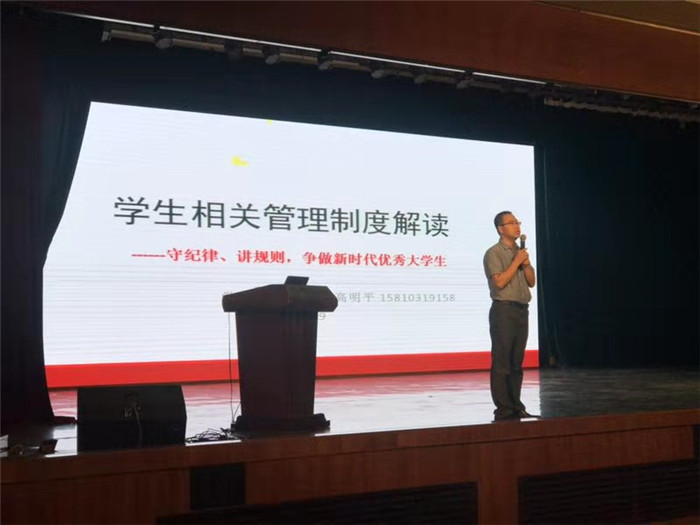 讲座第一部分由学生事务办公室副主任高明平老师做题为“学生管理相关制度解读——守纪律,讲规则,争做新时代优秀大学生”讲座。高老师从奖勤助贷、考勤、学生宿舍、行为学分、第二课堂及违纪处理等几个主要方面进行介绍。首先,高老师简单介绍了学生综合素质考评的相关资料以及评定方法,让新生们充分认识到德、智、体、美全面发展的重要性。接着,结合现实生活中的一些实际案例向同学们深入浅出地讲解了宿舍管理、宿舍安全、违纪处分等相关管理规定。针对宿舍管理,高老师希望同学们在今后的宿舍生活中彼此间要学会友好相处,多一些包容心,少一些斤斤计较,共同营造安全、文明、整洁、和谐的宿舍文化。最后表达了对大一新生的美好祝愿,希望他们学会学习、学会生活、学会做人,拥有一个美好的大学生活。