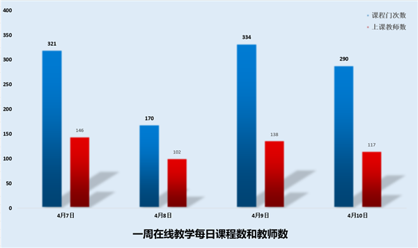 4月6日-4月10日期间,共有在线教学课程250门、1115门次;共有同学36083人次上课;共有190位教师进行了在线教学。学校积极落实了在线教学第七周对同学“全覆盖”的要求,基本保证同学每天在线学习。