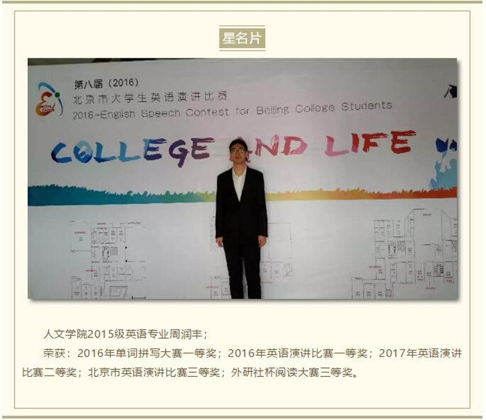 在耿丹,参加学科竞赛的机会很多。大二上学期我听说有北京市大学生演讲比赛,便决定去挑战一下。演讲一直是我在英语中薄弱的一环,所以我很早就开始准备,写好初稿后便和指导老师一起修改,前前后后一共改了十次以上。在之后两个多月的时间里,我对着镜子一遍遍纠正姿态、表情、断句、重音,最终顺利通过了学校的预选赛并拿到了演讲比赛的三等奖。虽然没能拿到好的名次,但那次参赛对我的心理素质、表达能力及控场能力都是一次极大的提升。我一直认为,参加活动时不要太功利。生活中很多技能是相通的,比如在耿丹樱花节做过讲解员之后,在演讲比赛上也会更加从容、大方。