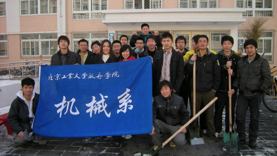 ,机械工程系机制091班班委利用午休时间,组织全班31名同学,在男生宿舍楼前开展义务扫雪活动。