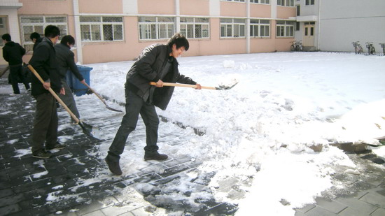 男生宿舍2号楼前地处阴面,下完雪后,积雪很难融化,给同学们的出行带来很大麻烦。为了同学们的出行方便和安全,机制091班自发行动,跟后勤部门借来铁锹和扫把,清扫楼前积雪。同学们齐心协力,分工合作,把楼前的积雪打扫的非常干净,为全校师生营造了一个干净整洁的校园环境。