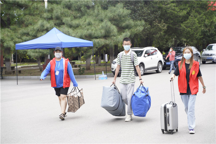 随着新生们陆续到来,报到现场也热闹了起来。核酸检测阴性证明、测量体温、行李物品消杀,一系列报到流程有条不紊的进行。新生同学们走进他们期待已久的大学校园,虽然大家都戴着口罩,也难掩内心的新奇和喜悦。