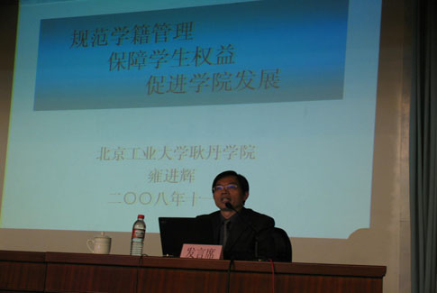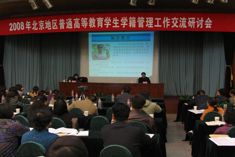 为贯彻落实教育部《普通高等学校学生管理规定》及普通高等学校学生学年电子注册有关文件精神,总结一年来北京地区高等教育学籍管理工作的有关情况,交流各高校及研究生培养单位在学籍学历管理工作方面的经验和体会,进一步提高依法治校、规范管理的水平。2008年11月13日至14日,由北京市教委举办的“2008年北京普通高等教育学生学籍管理工作交流研讨会”在北京颐泉山庄召开。教育部高校学生司学历学籍处解汉林处长和北京市教委郭广生副主任、北京市教委学生处杨文茹处长、沈聪伟副处长及近百所高校的学生学籍管理工作人员参加了此次会议。