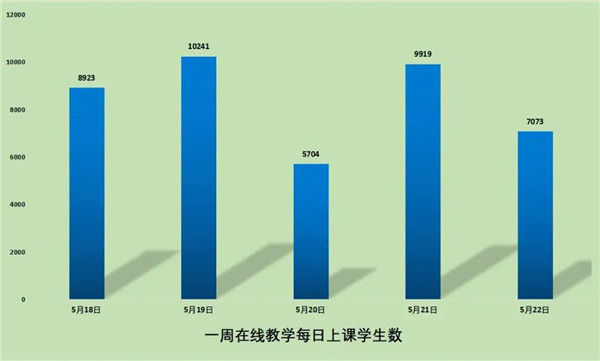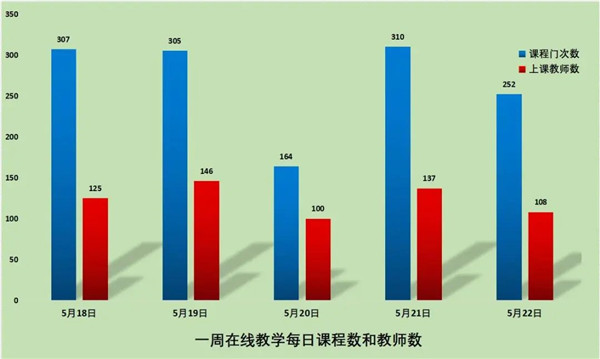 5月18日-5月22日期间,共有在线教学课程244门、1338门次;共有同学41860人次上课;共有196位教师进行了在线教学。学校积极落实了在线教学第十三周对同学“全覆盖”的要求,基本保证同学每天在线学习。