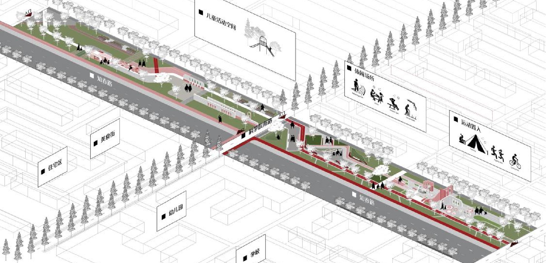 作品简介:本次街道改造思想以满足儿童使用功能为主,建筑与绿化相互融合,相辅相成,在体现场地设计的以人为本、因地制宜、崇尚自然的前提下与儿童自然教育相结合,通过对儿童自然缺失症针对性设计,打造社区街道中儿童乐园。