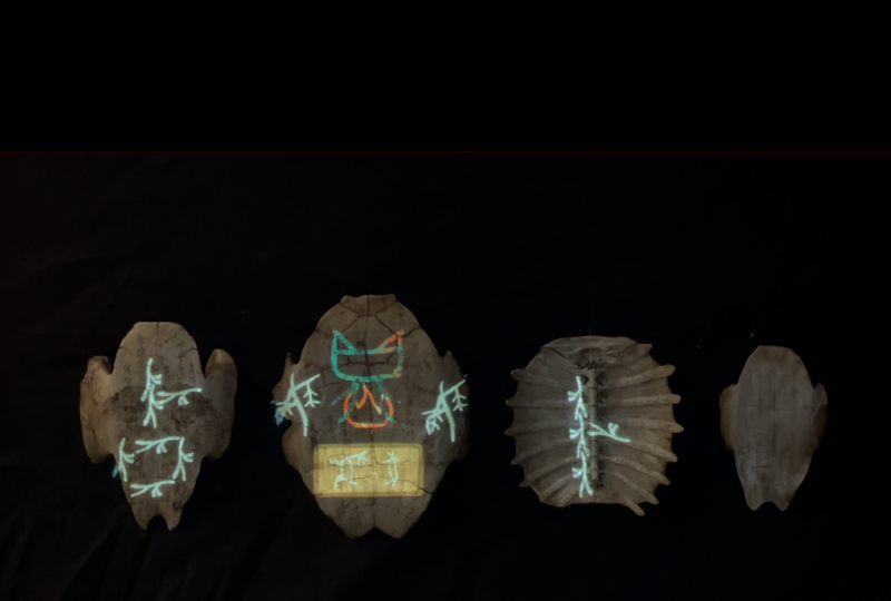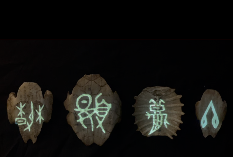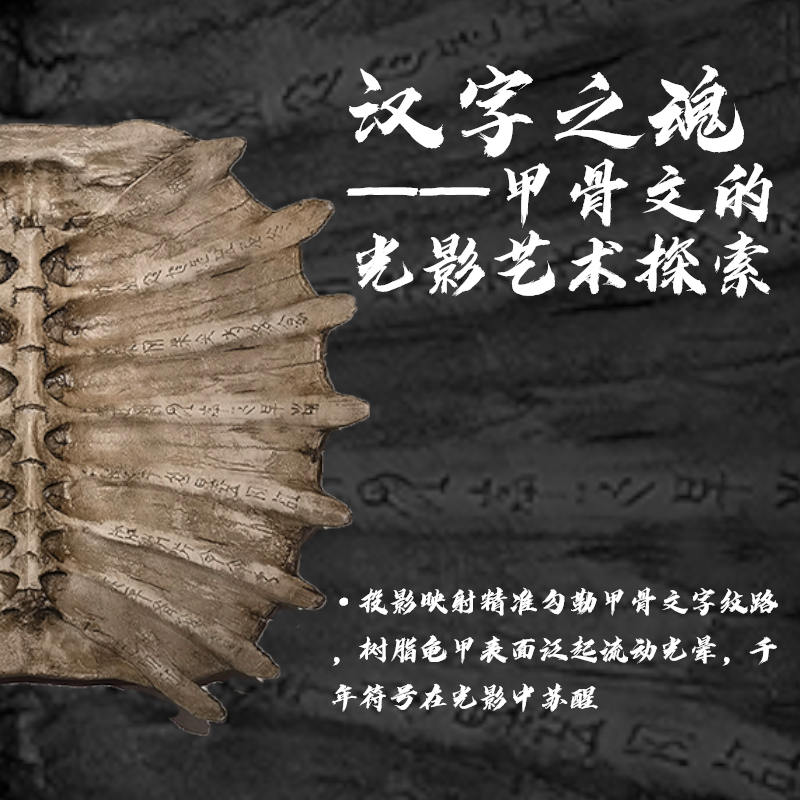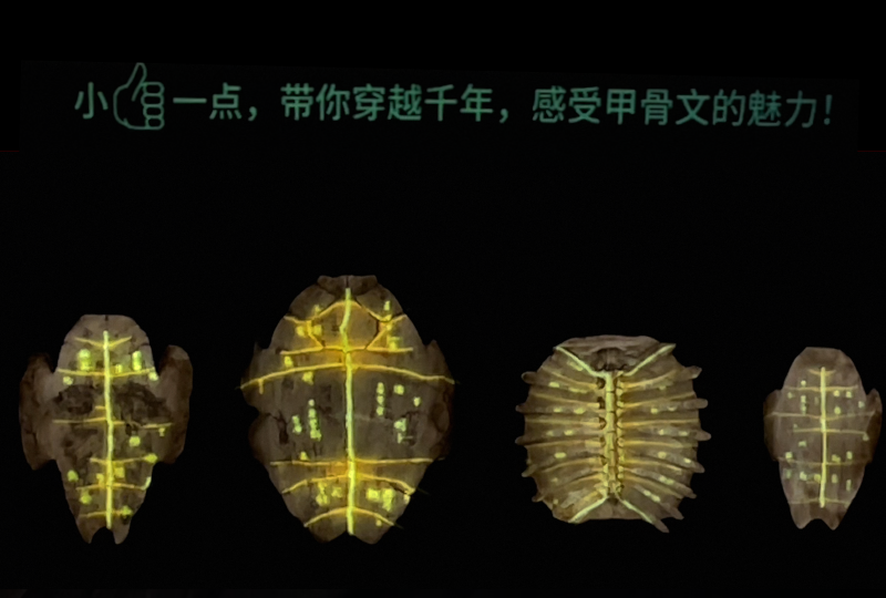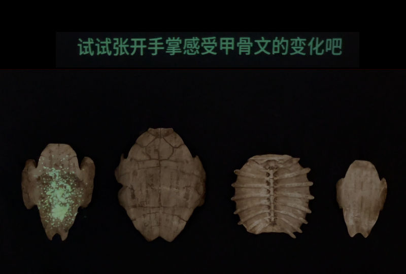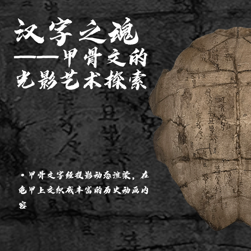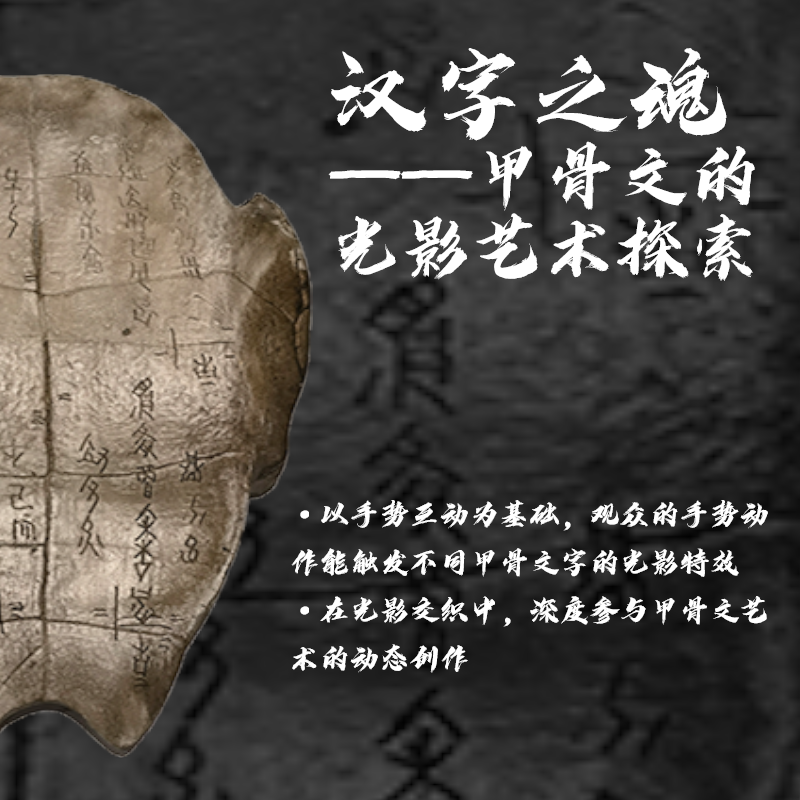 作品简介:《汉字之魂 —— 甲骨文的光影艺术探索》/以四块树脂材质的龟甲为载体,通过投影映射技术将动态甲骨文动画投射于甲骨表面。观众通过手势交互可操控动画切换。作品将数字内容与实体文物形态融合,依托树脂材质与摄像头手势捕捉系统,让甲骨文字从龟甲纹路中“苏醒”,在虚实共生的光影场域中,构建可触控的“活态文物”,重现汉字源流的灵性表达。